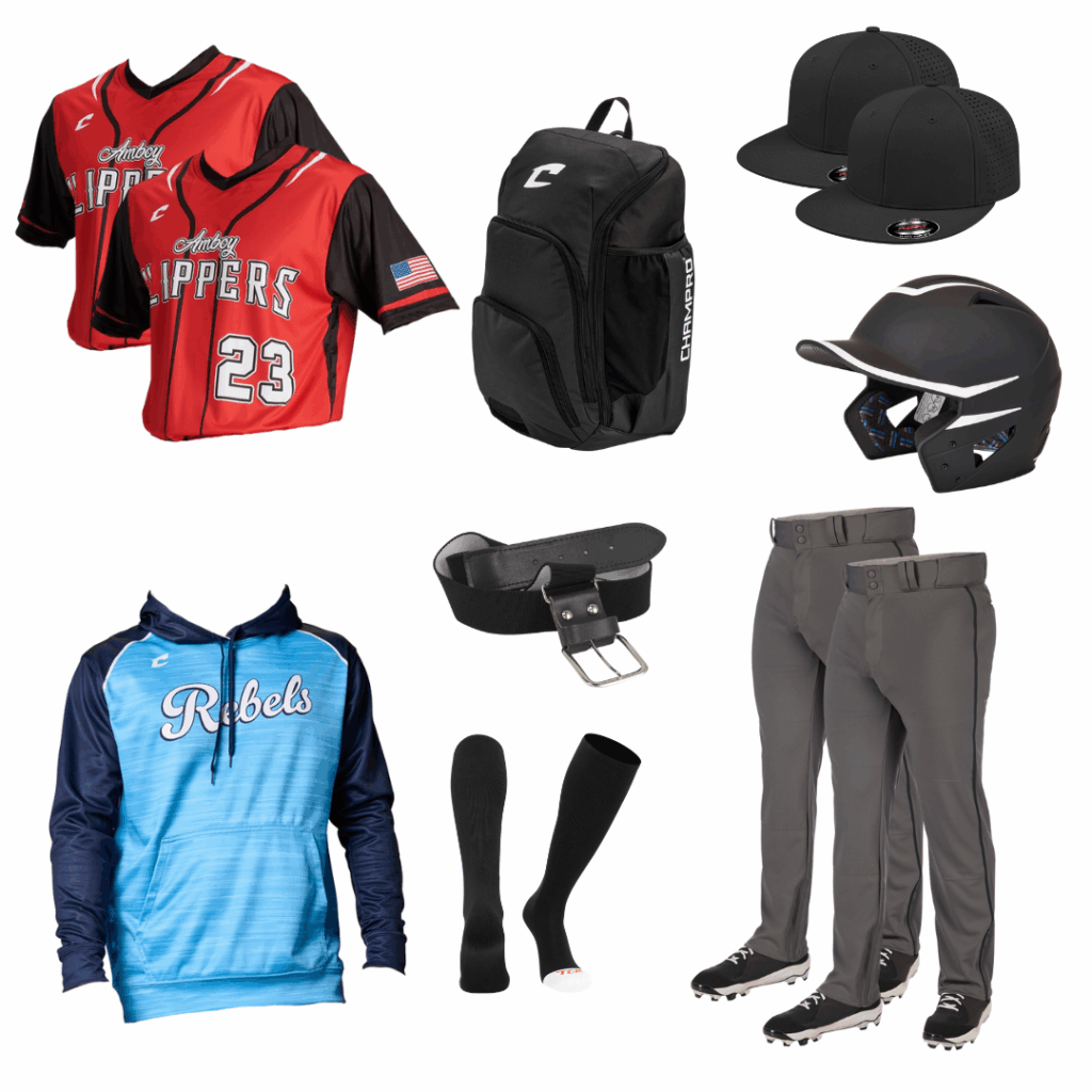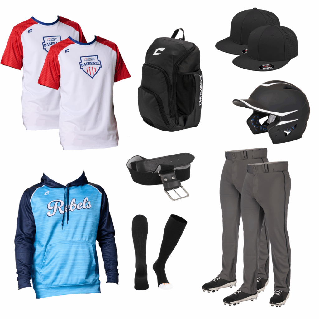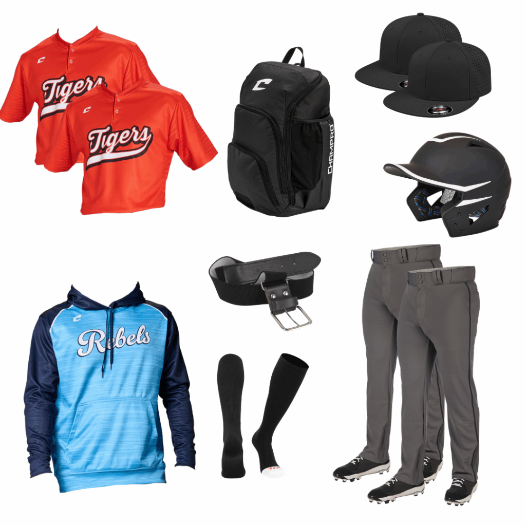 2 Jerseys | 2 Hats | 2 Pants | 1 Hoodie | 1 Socks | 1 Belt | 1 Backpack | 1 Batting Helmet